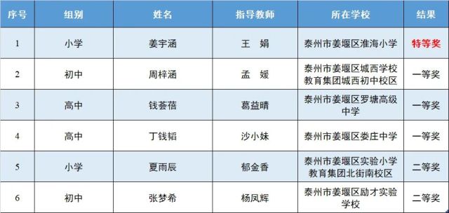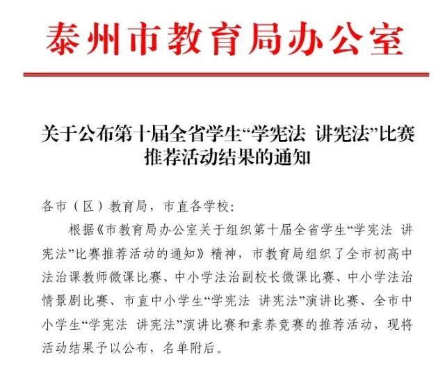 泰州市教育局公布了第十届全省学生“学宪法 讲宪法”比赛推荐活动结果通知