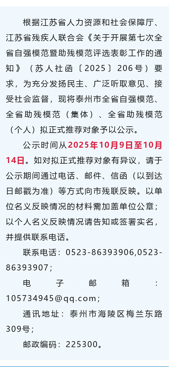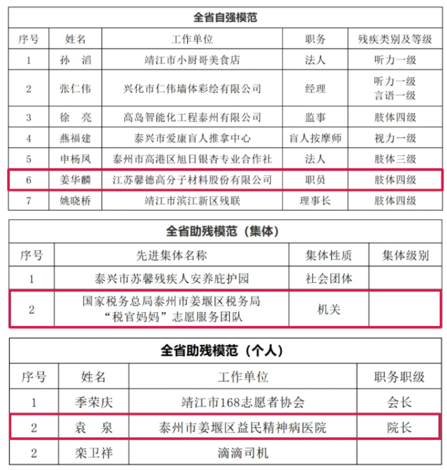 内附:泰州市全省自强模范暨助残模范拟正式推荐对象名单及简介