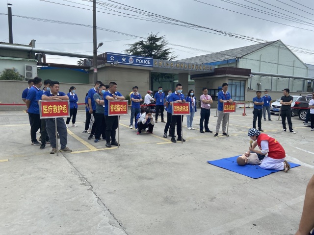 演练模拟“一名检修人员在更换设备时不小心坠落污水处理池”情景,同行人员立刻拨打值班室电话,保安人员和后勤人员随即启动应急救援预案,应急救援组、现场通讯组、警戒指引组、医疗救援组迅速各就各位,立即开展有序施救,及时打捞出了溺水人员,并规范实施心肺复苏。