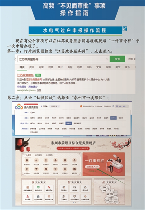 持续推动政务服务“智慧化”转型,高标准建设政务服务网姜堰旗舰店,62个“一件事”套餐全流程网上可办,实现企业和群众办事“只进一张网,办成所有事”,足不出户、就能畅快体验“网购”一般便捷的政务服务。积极融入区域一体化发展,拓展长三角“一网通办”事项,实现与长三角地区范围内政务服务中心“实时联动办理、线上双向审批”。通过增设政务服务自助一体机,印制《自助办政务服务事项操作指南》,扩展自助服务,将更高质量、更高效率的政务服务送到群众手里,让自助服务的便利辐射更多群众。