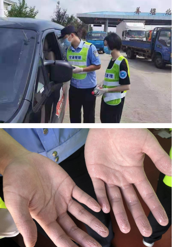 在S28启扬高速姜堰北收费站卡口,来自江苏警官学院的周钰珵、景家驹、王瑾妍、陈雨乐、周雨萌5名同学和来自南京医科大学的周润菁协助交通管控人员做好来往车辆人员的苏康码、行程码、体温的查验以及登记、劝返等工作。一连几个小时的奋战,他们早已是汗流浃背,摘下不透气的乳胶手套,手指都因为被汗水长时间浸泡而起皱。周钰珵说:“我们大学生要积极行动起来,为疫情防控工作贡献自己的一份力量,作为一名警校生,我更是要义不容辞站出来,加入这场战斗。”
