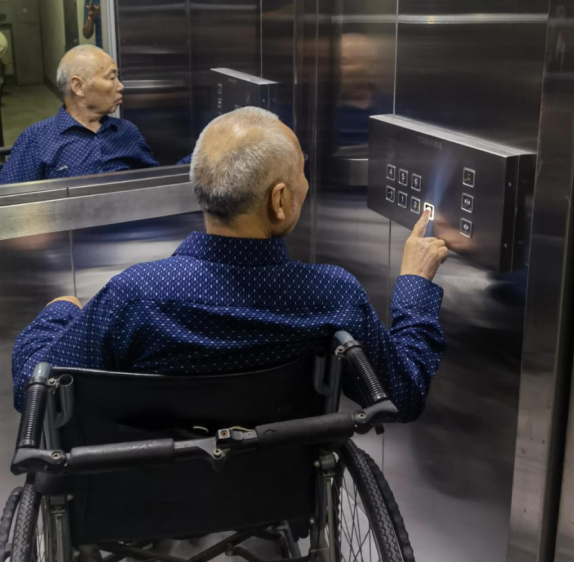 据了解,无障碍电梯在电梯里三面都安装了扶手,侧面还安装了一米左右带盲文的选层按钮,老人可以安稳地扶着扶手出入电梯,选层按钮也伸手就能按到。另外,轿厢正面还安装了一整面镜子,老人坐着轮椅面对着镜子也能看到电梯门的状态。与此同时,还有语音报层,可谓十分便利。