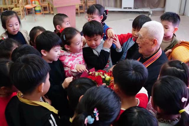 校明儒1933出生,他参加过抗美援朝战争,他每次出去宣讲,都认真备好功课,每次宣讲,内容都不一样,他还把红色故事整理成册,不同年龄、不同人群,他讲的故事都不一样。今年七月,泰州市姜堰区第二实验幻儿园邀请他为幼儿讲故事,他专门讲解了抗美援朝战场比赛抓俘虏的故事,他用自已亲历的场面,讲述了活捉俘虏的故事。“我和战友一边冲锋消灭美国佬,一边大声喊话,缴枪不杀,也因抓俘虏勇敢,荣立了三等功……。”他讲得娓娓动听,幼儿们被他的故事所吸引。“校爷爷,再讲一个。”