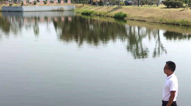 图为顾高镇西芦村党支部书记邰迎华巡查沟塘中
