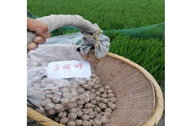除此以外,用赤眼蜂防治水稻二化螟这种“以虫治虫”的生物防治技术也在基地里得到了应用。赤眼蜂是一种卵寄生蜂,在害虫的卵中产卵寄生,卵中孵化出的赤眼蜂幼虫吸食卵液的营养后羽化成蜂破壳而出,同时产生一种病原微生物感染害虫幼虫,达到“蜂灭卵、菌灭幼虫”的双重控制作用。在孕穗期基地里进行赤眼蜂放养,每亩田只需要投放三个赤眼蜂放蜂器,赤眼蜂扩散距离为15-20米,每隔5-7天投放一次,每亩田成本只有15元左右。
