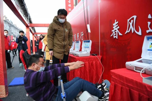 在春风送温暖体育惠民行活动现场,泰州市体育局、姜堰区文体广旅局现场开展流动国民体质监测车检测服务,针对群众体质状况进行分析、解读,出具健身指导报告。并发放健身宣传资料、赠送健身小器材,开展健身技巧现场指导。