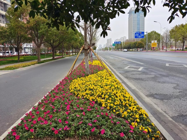春光烂漫,走在姜堰区上海路,紫色矮牵牛和黄色三色堇,在春风中竞相摇曳,展示着美丽风姿。