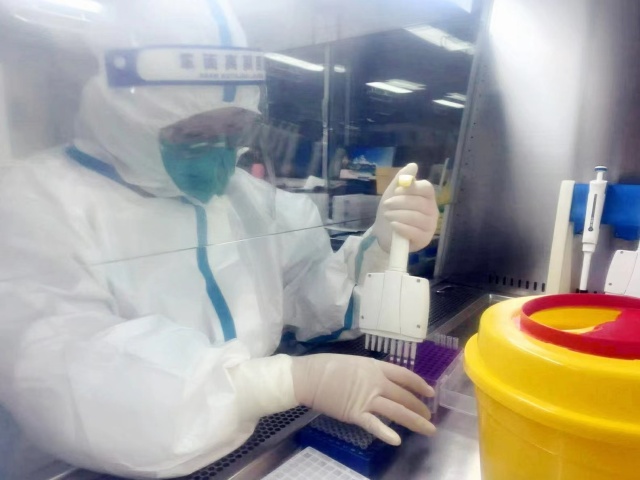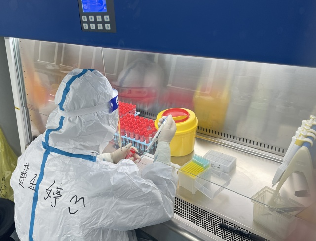从进入检验室起,费玉婷穿着密不透风的防护服,不能喝水,不能吃东西,每班8个小时以上,精神保持高度集中。每次做完检测手上虎口酸痛、四肢僵硬,费玉婷说,过了那一阵也就没感觉了,每天一轮全员核酸要完成338批近49万人次的检测。