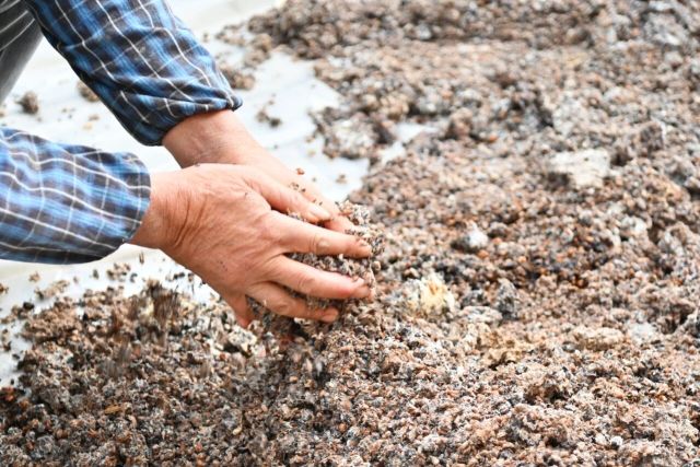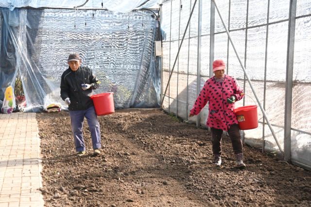 大棚内,泥土的清香与菌种的微腥气息交织。工作人员合力将成袋的菌种从货车上卸下、排列整齐,随后拆袋倒出褐色的菌种颗粒,反复搓揉,碾碎结块,确保菌种松散均匀。分拣好的菌种被装入干净的塑料桶,再由工作人员均匀播撒,每一道工序都一丝不苟。