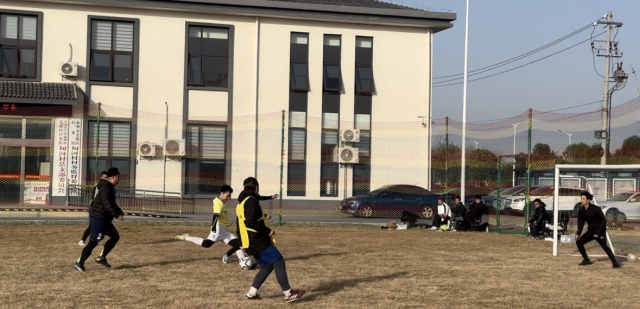 下午两点,随着裁判清脆的哨声,首场足球赛正式拉开帷幕。赛场上,20余名爱球人士分成两队,身着不同颜色队服,迅速进入比赛状态。球员们默契配合,时而快速传球突破防线,时而奋力奔跑拦截射门,每一次精准传球、每一次精彩扑救,都让现场氛围不断升温。赛场外,村民们也是欢呼声不断,孩子们在一旁追逐嬉戏,加油声、呐喊声、欢呼声交织在一起。“运动员们在球场上跑得起劲,我们在旁边看着也开心,以后不仅能散步健身,还能常看到球赛。”村民王宝国满是笑容地跟工作人员说道。