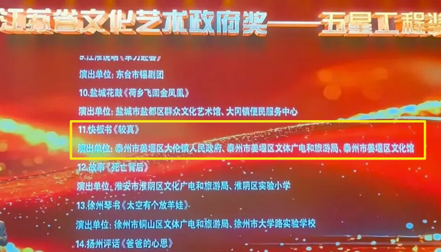 近日,“共绘时代艺术新篇”——江苏省文化艺术政府奖颁奖仪式暨优秀作品惠民展演在江苏大剧院圆满落幕,我区作品快板书《较真》再度登榜荣获江苏省第十六届五星工程奖,这是泰州市本届唯一的一部曲艺类获奖作品,也是该作品继获得第六届江苏省曲艺、喜剧小品展演二等奖、优秀创作奖之后取得的更高荣誉。五星工程奖是江苏省群众文化政府最高奖项,从第十六届开始由江苏省人社厅、文旅厅共同主办,每三年举办一届。
