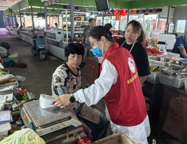 结合现场实际情况,此次活动创新性地采用 “固定咨询 + 流动服务” 的形式开展。一方面,在娄庄菜市场入口处设立了固定的健康咨询台,并悬挂了横幅。台上整齐有序地摆放着电子血压计等健康服务工具,同时清晰划分出健康检测区与科普讲解区。另一方面,医务人员携带便携式电子血压计深入市场内部,为那些因忙于经营而无法离摊的商贩,以及正在采购食材的居民提供 “零距离” 的 “摊位边” 血压测量服务。这种灵活的服务方式充分满足了更多群众的需求,迅速吸引了大量商户与居民参与其中。