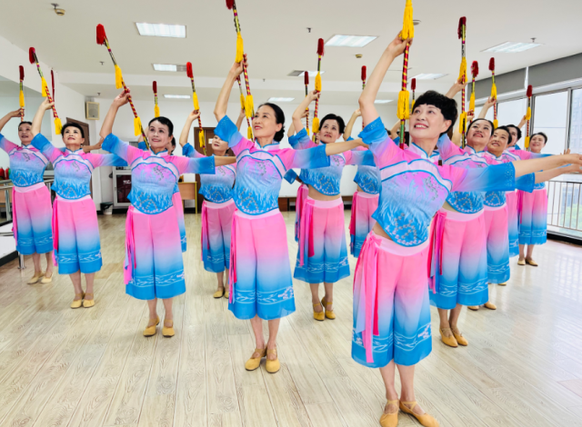 在姜堰区老干部大学舞蹈教室内记者看到,三水舞韵舞蹈队的队员们簇拥在该区老干部大学体艺室主任苏琴身旁,通过手机回看当时的表演视频。视频中,音乐旋律一经响起,身着统一服饰的队员们手持彩莲湘翩然登场。她们身姿挺拔、动作齐整,彩莲湘在腕间、腰间、膝间灵活翻飞,碰撞出清脆悦耳的节奏。每一个动作都饱含对非遗文化的赤诚热爱,每一段舞步都彰显银发舞者的优雅与朝气,将滚莲湘特有的动感韵律演绎得淋漓尽致,现场观众的掌声与喝彩声此起彼伏。苏琴说:“那天看现场直播视频时,其实我也在担心,这支队伍中年龄大的68岁了,她们真不容易。这么热的天一直坚持排练,我为她们点赞。”