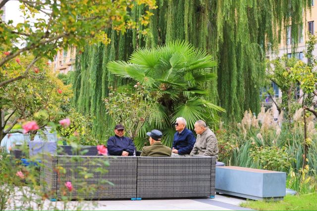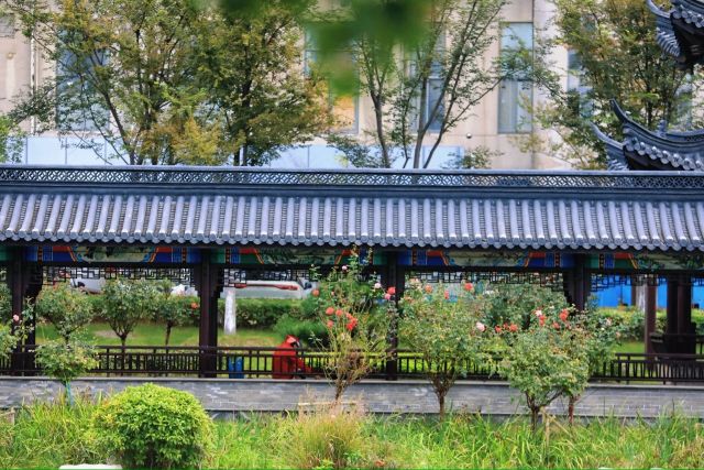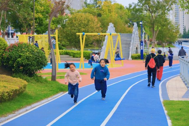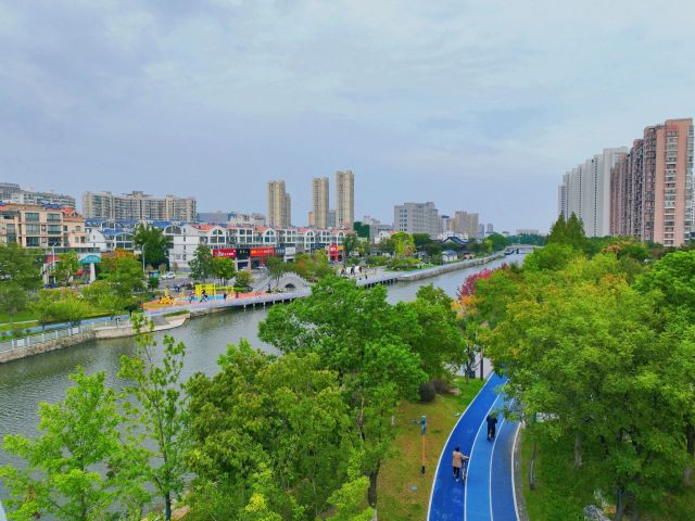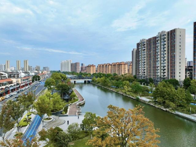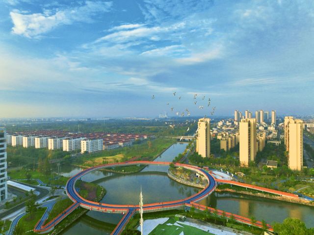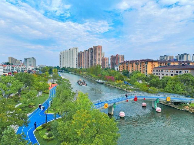 蓝天白云,群鸟翱翔,三水之环如红蓝彩练舞于通扬河碧波之上。河风拂过,隐约带来桂花甜香,与岸边垂柳的清新交织。蓝跑道上孩童追逐嬉戏,老人闲坐笑谈,骑行者与散步者的身影掠过树影斑驳的弯道。中式亭台畔,游人凭栏赏水,秋叶与粉花点缀其间,让这座城市的绿脉里,满溢着自然清趣与人间烟火交织的诗意。(朱珠)