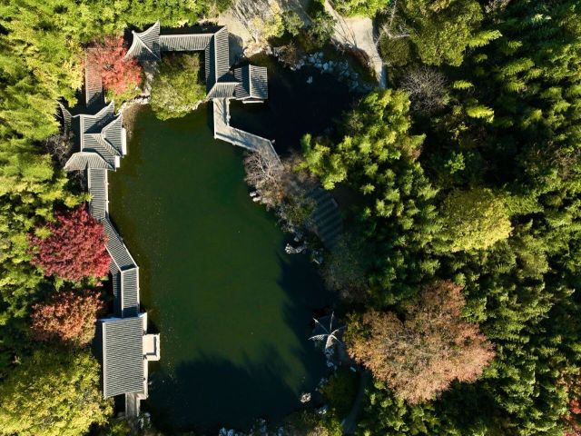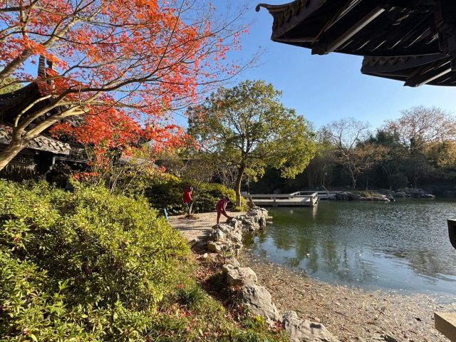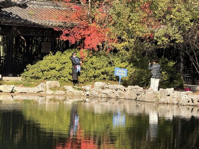 冬日的万竹园,红枫似火,映衬着白墙黛瓦。游人在湖畔漫步、拍照,水面风平浪静,倒映出斑斓的色彩。时有悠扬的歌声从亭廊间隐约传来,为这幅静谧的园林画卷添上一抹生动的韵律。(朱珠)