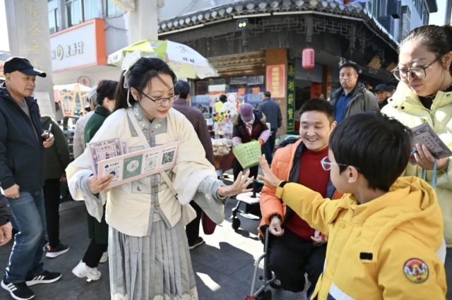 活动当天,古镇老街人头攒动、暖意融融。身着汉服的青蓝学员化身流动NPC,分散在老街各处,引导游客关注“寻溱记”等官方账号领取银票,还通过石头剪子布、成语接龙、溱潼常识问答等趣味小游戏与游客互动,赢取银票的游客脸上满是喜悦。