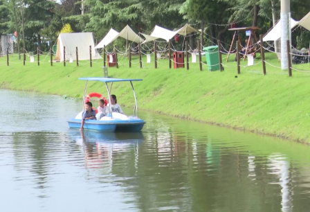 在池塘一侧的草地上,十几个大小不一的天幕帐篷在湖边错落分布,游客们三五成群,摆开折叠桌椅,放上美味佳肴,体验休闲好时光。不少孩子在一旁戏水、抓龙虾,尽情体验愉悦的假期。