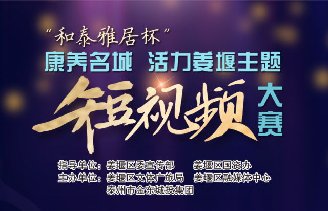为充分彰显姜堰深厚的文化底蕴、展示姜堰日新月异的发展变化,记录姜堰奋进新征程的坚定步伐,定格姜堰推动高质量发展勇立潮头、走在前列的无尽活力,讴歌姜堰昂扬向上的精神风貌,在中共泰州市姜堰区委宣传部、区国资办指导下,区文体广旅局、区融媒体中心、泰州市金东城投集团联合主办“和泰雅居杯”康养名城 活力姜堰短视频大赛,现面向社会征集参赛作品。