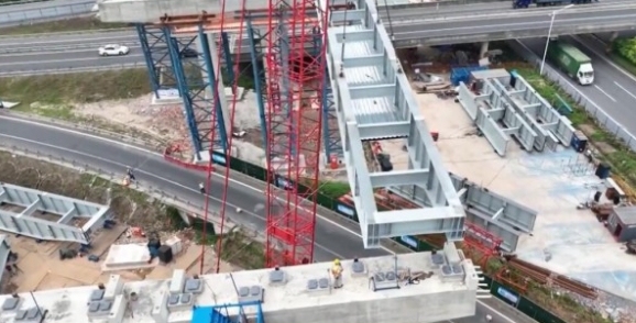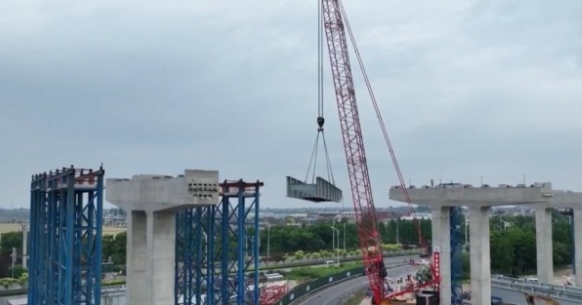 5月22日,江阴靖江长江隧道北接线项目钢板组合梁架设作业中体量最大的钢梁开始吊装,靖江互通钢板组合梁架设工作预计6月底完成,整个北接线项目建设已完成工作量的60%。