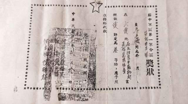 在这里,记者还看到一张房云海立三等功的奖状复印件。奖状是由苏中军区第一军分区台北警卫团颁发的,表彰房云海在反扫荡中机动灵活完成任务,落款时间为中华民国卅七年贰月拾日,即1948年2月10日。
