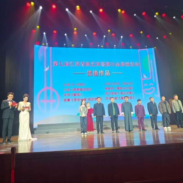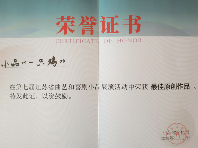 11月21日—23日,由江苏省文化馆、淮安市文化广电和旅游局共同主办,淮安市文化馆承办的第七届江苏省曲艺和喜剧小品展演活动在淮安举办。由姜堰区文化馆创排演出的喜剧小品《一只鸡》作为泰州唯一代表作品参演,以喜剧小品专场第三名的成绩荣获优佳作品和最佳原创作品两个奖项,并且获得与会专家评委以及广大观众的高度好评。