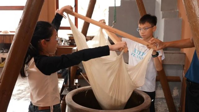 这个长假,姜堰区大伦镇朱宣村的研学基地很是热闹。豆腐坊中,孩子家长分工明确,有的拉磨,有的加水,续写着老手艺里的温情。石磨转动间,黄豆慢慢化作细腻的浆汁。初成的豆浆被小心倒进木架上的纱布里,大家握着纱布四角,轻轻收拢,过滤后的浆液落在下方的石缸中。烧制点卤、挤压成型,每一步都藏着讲究。
