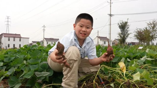 秋天是收获的季节。研学基地内种植的红薯熟了,小游客们拎着竹篮,握着铲子,蹲在田垄间,拨开藤蔓,顺着泥土凸起的地方慢慢挖开,像是在“寻宝”一样。因为是第一次接触,不少孩子脸上都沾了泥土。可当红薯被完整挖出时,所有的“狼狈”都变成了惊喜,大家争先恐后地展示着“战利品”。