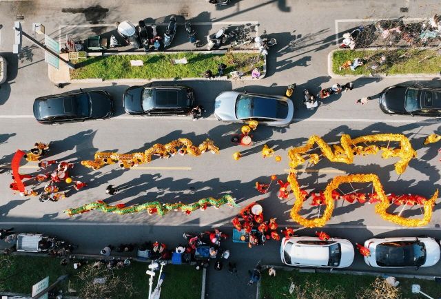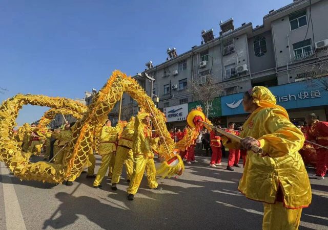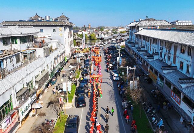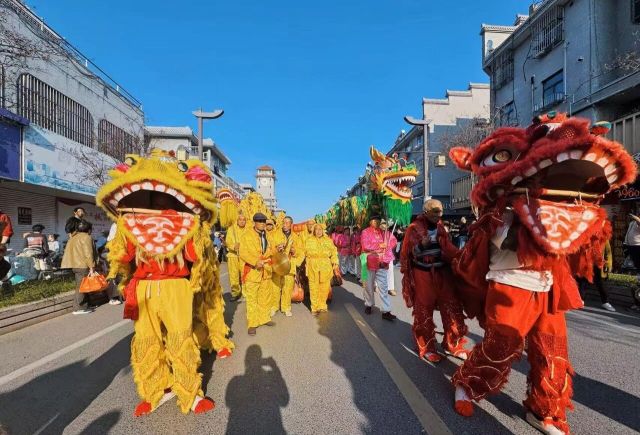 农历九月十六是溱潼镇的传统庙会。这一天,溱潼古镇热闹非凡:舞龙队伍穿梭于老街,金黄与鲜红的巨龙翻腾起舞;舞狮表演灵动威武,锣鼓喧天;街头的高跷艺人引人驻足。传统民俗与现代商铺相映成趣,人群熙攘,喝彩声此起彼伏。蓝天映衬下的古镇,洋溢着浓浓的节日活力与人间烟火气。(朱珠 钱金石)