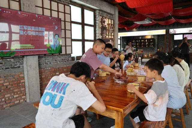 即议爱党爱国,在革命老区蒋垛镇蒋垛村军粮驿站,孩子们正在开展“红军饭里品苦甜,童心惜福共议事”议事活动,吃着粗粮野菜饭,孩子们纷纷感慨:“粒粒皆辛苦,要节约粮食!”“幸福生活来之不易,要永远感恩革命烈士!”“可以每月开展一次红色观影,让小朋友们都能记住我们的幸福生活是烈士用鲜血和生命换来的。”孩子们还画下了自己的“惜福小约定”:一碗满满的饭,旁边写着“吃光光”;一个空空的盘,旁边写着“光盘行动”;一颗红红的星,旁边写着“我爱中国”……他们的画作被贴进村里的橱窗,红色的种子扎根大人小孩的心房。