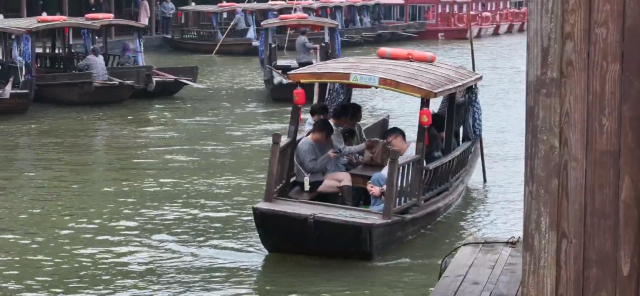 溱湖旅游景区摇橹船船娘说:“这段时间我们比较忙,游客也相当多。每个船娘每天要跑七到八趟。我们要在这里把所有的游客都接待好,还要唱唱我们当地的小调。每天都要把进来的游客送出去,不让一个游客滞留在里面,让他们玩得很开心。”