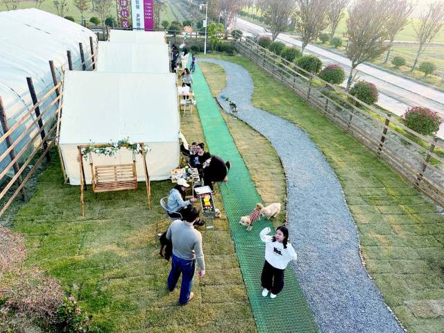 以宠物友好为特色的爪印Pet Paradise.露营,则成为养宠家庭的周末首选。作为泰州首个专门为宠物设计的露营基地,这里贴心配备宠物专属泳池、敏捷训练场和舒适休息区,让孩子们能尽情享受户外乐趣。记者在现场看到,不少市民带着爱犬在草坪上互动嬉戏,主人则在一旁交流养狗心得,喝着咖啡,吃着烧烤,享受周末时光。爪印pet paradise.露营工作人员夏子译说:“自10月28日开业以来,我们举办了小狗生日派对等活动,接待游客300多人次。”