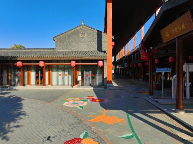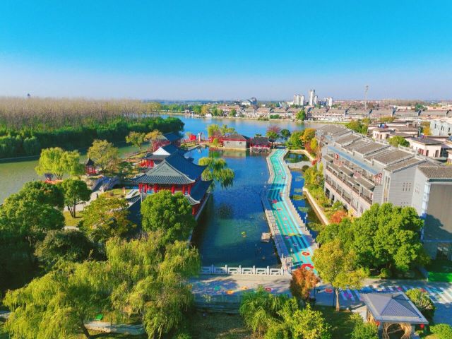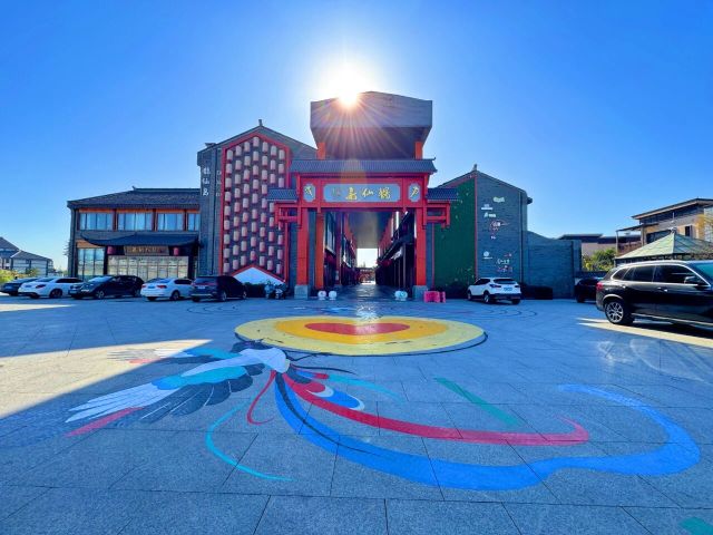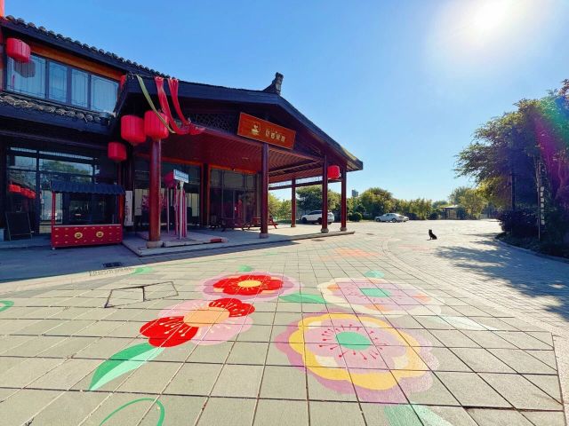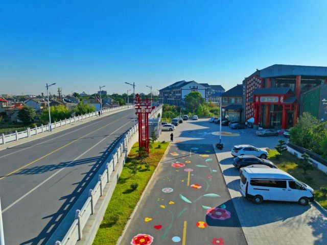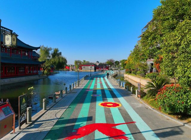 溱潼古镇的鹊仙岛,以传统中式建筑为基调,飞檐牵云,灰瓦叠梦,朱红的廊柱与暖黄的灯笼相映成趣。步道之上,彩绘如诗——飞鸟展翅欲翔,荷瓣含露将滴,几何线条勾勒现代韵律,为千年水乡添了一笔灵动的注脚。信步其间,时光仿佛被重新编织,古典的骨架与现代的艺术相拥,共谱一首栖居的诗。(朱珠)