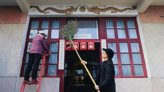 冬日渐暖、年味渐浓,中国的传统佳节“春节”日渐临近。在姜堰区张甸镇河垛村,一户人家正在掸尘。“掸尘”就是在竹竿上扎上青竹叶对着门前屋后各个角落进行打扫,寄托着劳动人民辟邪除灾、迎祥纳福的美好愿望。