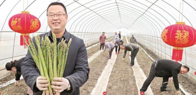 从初一到初五,刘宝银都蹲在塑料大棚里。不仅是他,村委工作人员及附近的多位村民几乎都是在大棚里过的年。昨天,记者来到现场时,到处挂着喜庆的大红灯笼,棚内棚外,他们有的采摘芦笋,有的修剪捆扎,有的过磅称重,笑容洋溢在脸上。