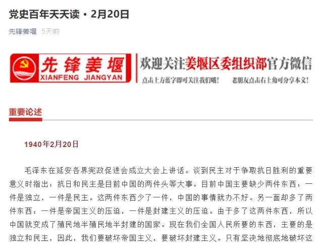 备资源提升教育成效。启动“堰上红云”党建综合服务平台建设,把党史、新中国史、改革开放史、社会主义发展史作为重点,增设百年建党史、党课开讲啦、主题党日秀等6个专栏,适时上线一批优质史实资料。加速苏维埃红色文化、重大项目实境课堂、红色生态旅游等4条党性淬炼线路建设步伐,丰富拓展线下学习教育资源。遴选一批“四史”书籍编制党史学习教育书目清单,广泛搜集8部反映姜堰历史的文史著作,开发一批“四史”微故事本土教材。
