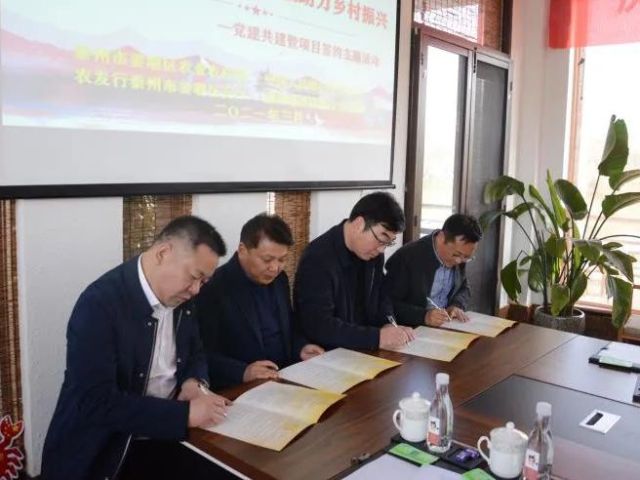 3月25日,在泰州市姜堰区溱湖绿洲旅游投资有限公司产业园区内,由中国人民银行姜堰支行、泰州市姜堰区农业农村局、中国农业发展银行泰州市姜堰区支行、泰州市溱湖绿洲旅游投资有限公司4家单位共同开展了以“庆祝建党100周年 金融助力乡村振兴”为主题的政银企党建共建暨项目签约活动。