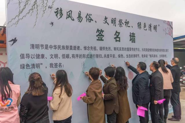 “为共度平安、绿色、生态的清明节,请以健康、文明、低碳、有序的形式进行祭扫,请大家在签名墙上签名承诺。”在引导员的带领下,梁徐街道全体祭扫人员在“移风易俗、文明祭祀、绿色清明”主题签名墙上签下自己的姓名。