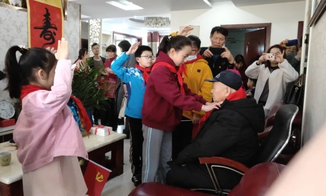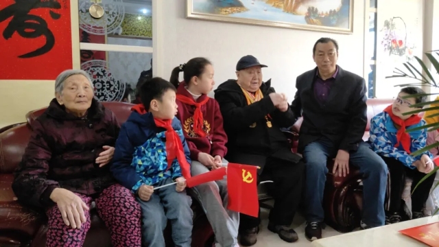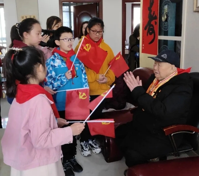 4月18日,姜堰区罗塘街道福田社区建国前入党的老党员吕斯金老人迎来了100周岁生日。社区党委组织部分党员、小学生到老人家里,开展“家国同庆 共贺百年”祝寿活动。