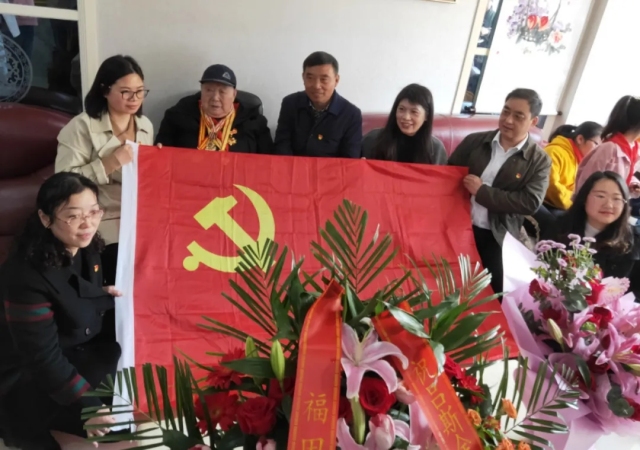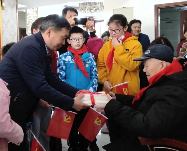 活动中,党员们不仅送上了慰问金和鲜花、蛋糕、祝寿书画,还送给老人一份特殊的红色生日礼物——一套党史学习资料,并现场播放党史学习教育片,和老人齐唱红歌《唱支山歌给党听》。