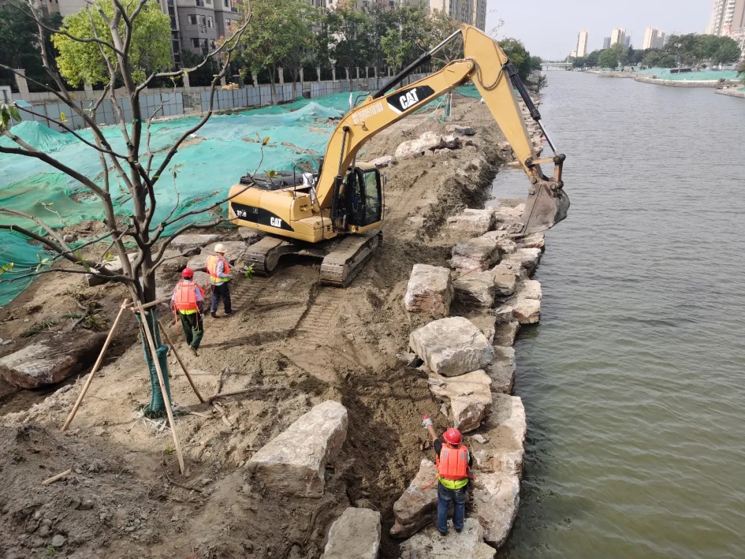 一城清水长流,两岸景色俏人。——纪老通扬河-中干河道绿化景观提升工程实施进展9月25日上午,在泰州市姜堰区老通扬运河南侧的工程施工现场,施工人员正顶着骄阳烈日、挥汗洒水,在挖掘机的协作下安装景石。放眼望去,河岸景石“矩阵”已基本成型。施工现场秩序井然,呈现出一派紧张忙碌的建设景象。据