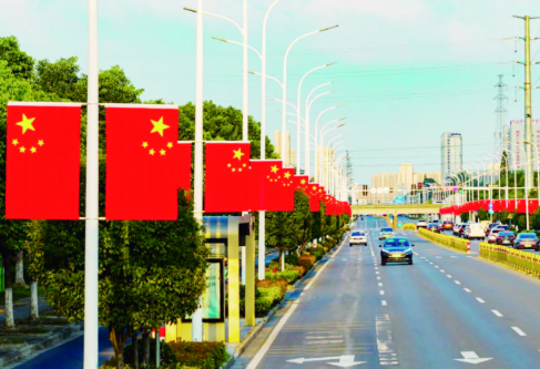 有一种骄傲,叫“五星红旗”;有一种表白,叫“我爱你中国”。随着国庆佳节的脚步日益临近,姜堰大街小巷悄然换上节日盛装。在陈庄路三水街道段,放眼望去,大道上悬挂在路灯上的五星红旗整齐划一,顺着路灯一路延伸,场面十分壮观。那一抹抹鲜艳的“中国红”格外夺目,仿佛在诉说着对祖国的深情祝福